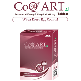 Description: CoQ ART® is an advanced mitochondrial support formulation designed to enhance reproductive health, particularly in DOR and failed IVF cycles. It combines scientifically studied doses of Trans-Resveratrol (150 mg) and Ubiquinol (100 mg), the active reduced form of Coenzyme Q10. Enabled by US-patented FenuMat® technology, the formulation focuses on improved stability and enhanced bioavailability